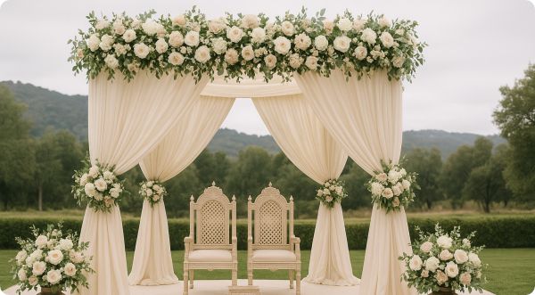 At WeddingMandap.uk, we design layered palettes so the mandap complements both daytime and evening ceremonies.